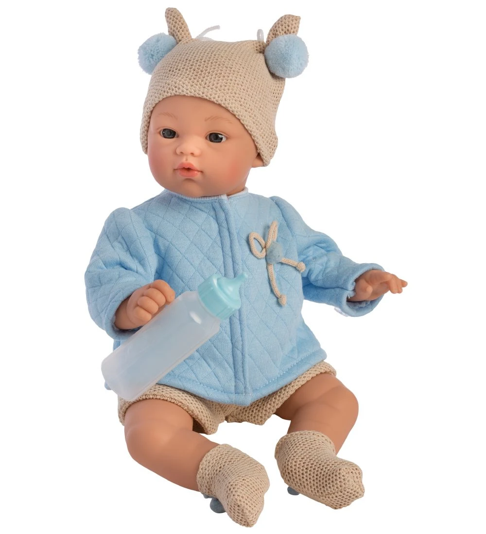 Sød Asi dukke med en termojakke, en strikhue, et par shorts, et par strømper og en sutteflaske i hvid, beige og lyseblå.