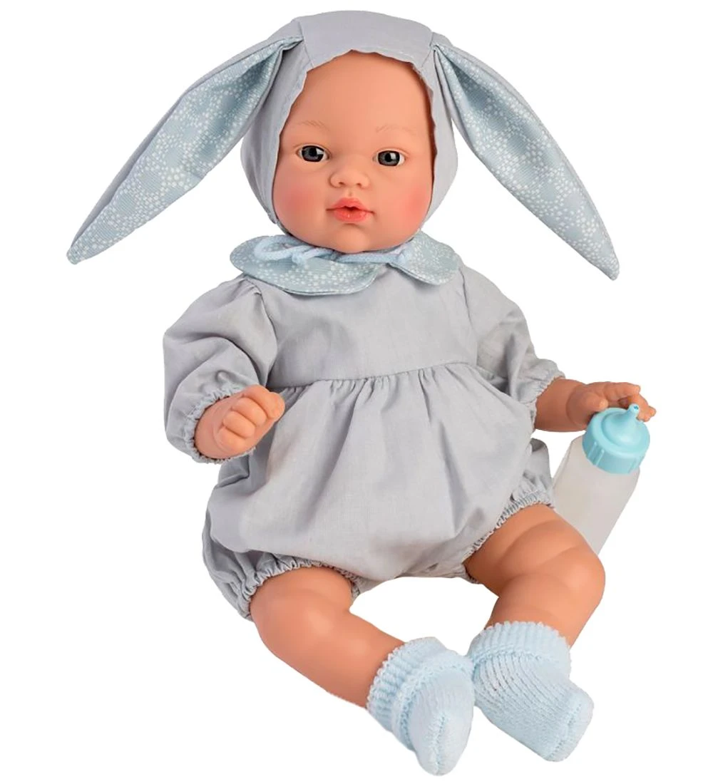 Asi babydukken Koke har en fin heldragt på i lyseblå, med en fin fin flæse i halsen med hvide prikker. Heldragten åbnes med velcro på ryggen. Koke har en fin hue i samme blå nuance som heldragten, med lange kaninører på toppen med en blå inderside med hvide prikker. Dukken har et par blå strømper på og en medfølgende flaske i gennemsigtig plast, med et blåt låg.