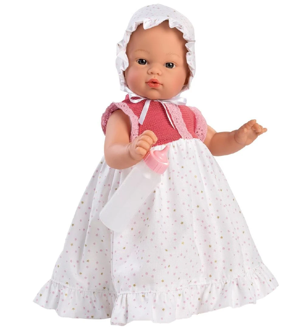 Asi babydukken har fin kjole i hvid, med stjerner og cirkler i rosa og guld, med en strikket del i rosa i toppen. Huen matcher kjolen og har en fin sløjfe fortil. Bloomersene er hvide og sutteflasken har et rosa låg, som kan skrues af. Kjolen åbnes med velcro på ryggen.