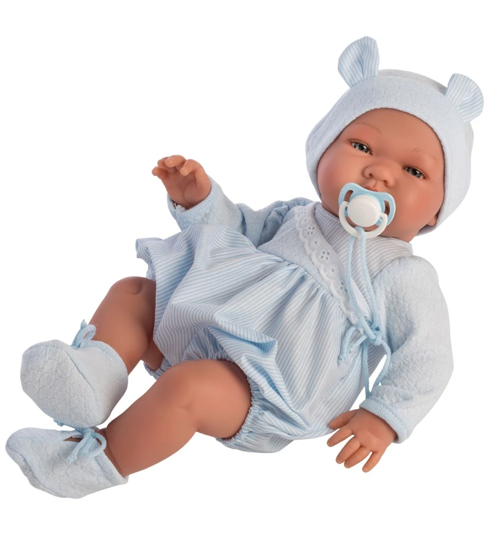 Flot Asi dukke med en fin sommerdragt, en hue, et par hjemmefutter og en sut i hvid og lyseblå.