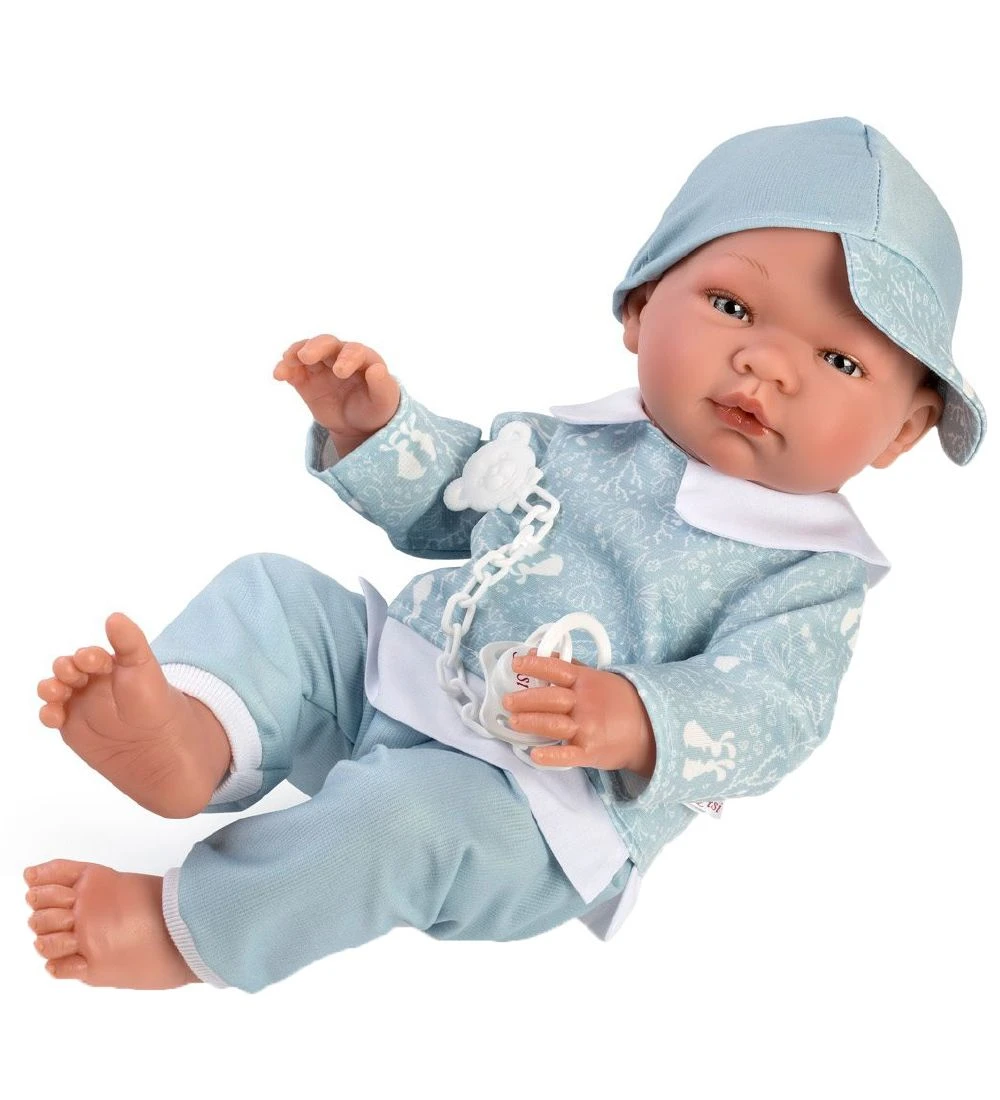 Skøn Asi dukke med en fin bluse, en kasket, et par bukser og en sut.
