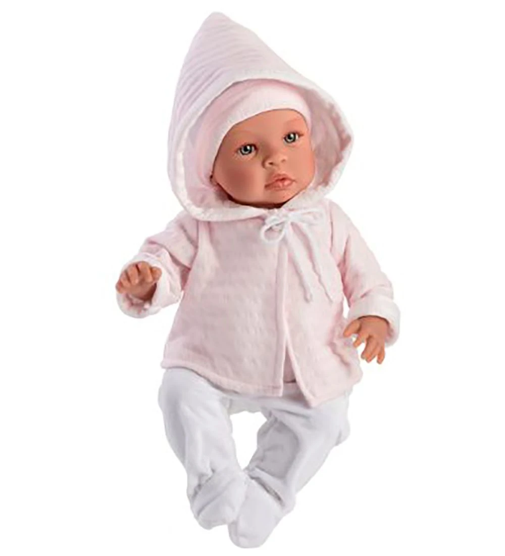 Asi babydukken har en fin jakke i rosa med hulmønster. Jakken har en fast hætte, og den åbnes med bindebånd i halsåbningen. Dukken har et par bukser i hvidt velour. Bukserne har en smal elastikkant i taljen samt faste fødder. På hovedet har hun en sød hue, som er i hvidt velour med en rosa kant med hulmønster.