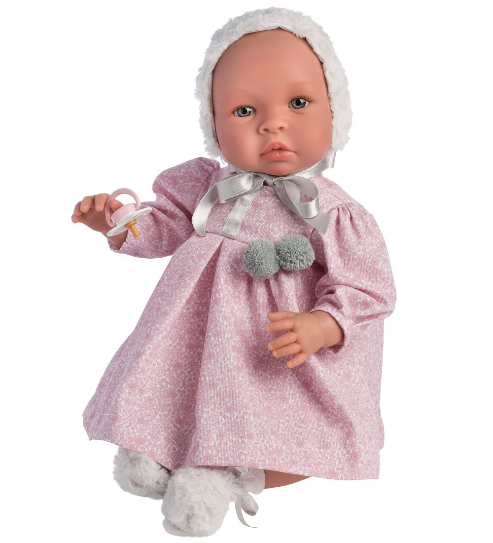 Asi babydukken Leonora har en fin kjole på i hvid med et allover print af rosa blomster. Foran har kjolen en grå stribe og to pomponer i grå. Kjolen åbnes med velcro på ryggen. Under kjolen har dukken et par bloomers i hvid med elastikkant. På hovedet har Leonora en hue i hvidt teddyfleece som bindes med et gråt bindebåndmed. På fødderne har hun et par hjemmefutter på i teddyfleece som huen. Sammen med Leonora medfølger der en hvid og rosa sut.