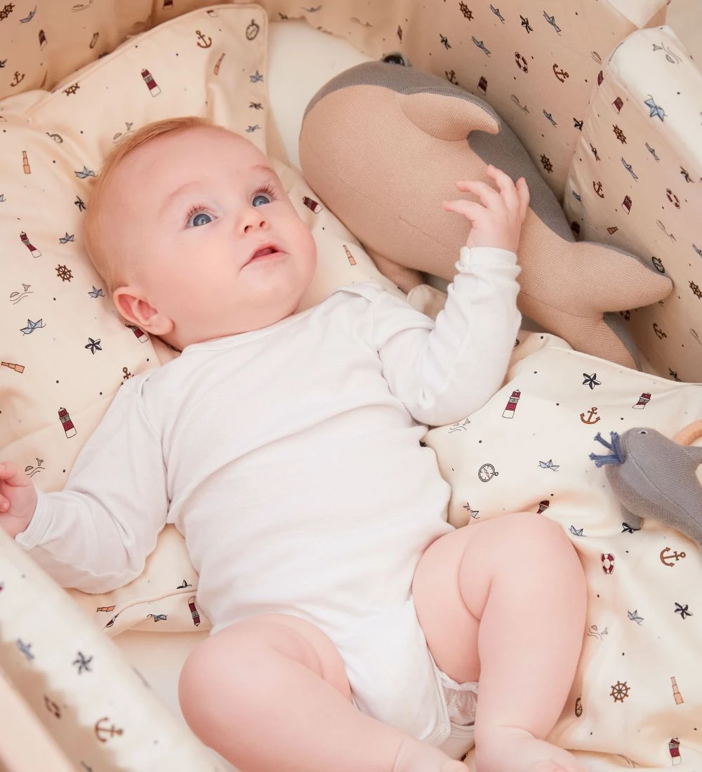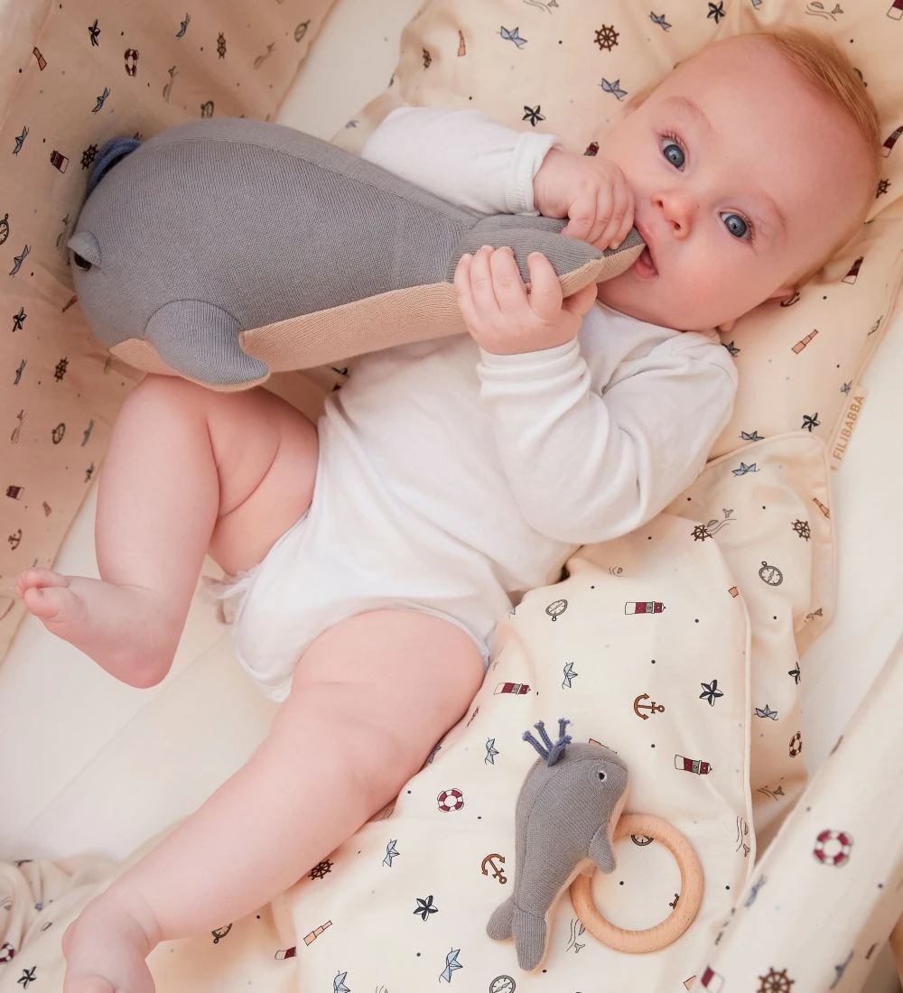 Filibabba bamsen er lavet i en fintstrikket kvalitet med et blødt tfyld. Hvalen er håndlavet, så hver bamse er helt unik.