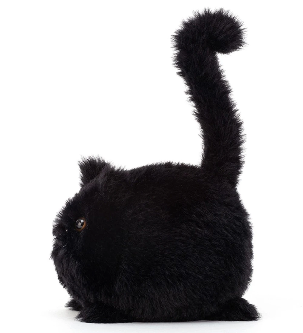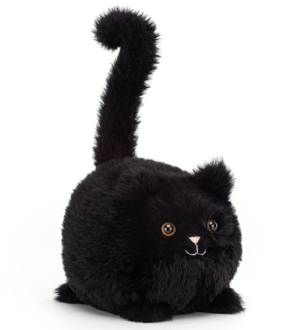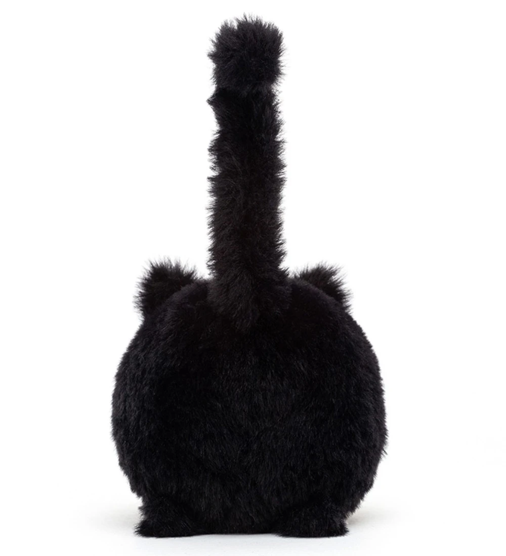 Sød Jellycat bamse formet som en sort kattekilling med brune øjne, en rosa næse og en lang, glad hale.