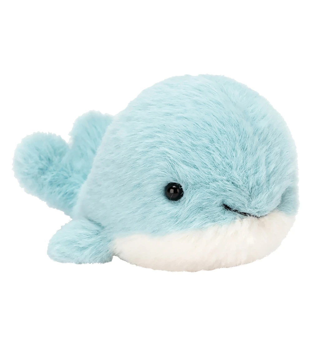 Fin Jellycat bamse formet som en hval i lyseblå og hvid plys.