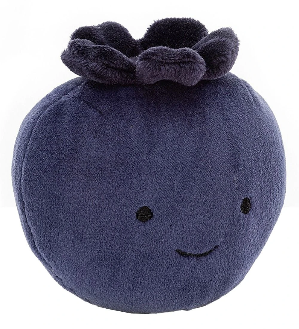 Sjov Jellycat bamse formet som et mørklilla blåbær med sorte, broderede øjne og mund.