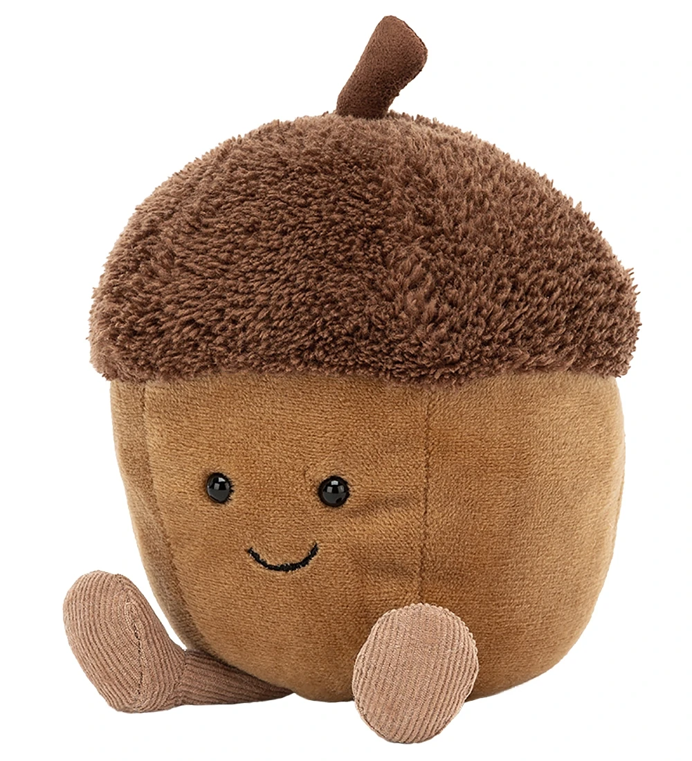 SødJellycat bamse formet et agern i brune nuancer. På siden er der to sorte plastikøjne og en sort, broderet mund, og i bunden sidder der to lange brune ben af fløjl.