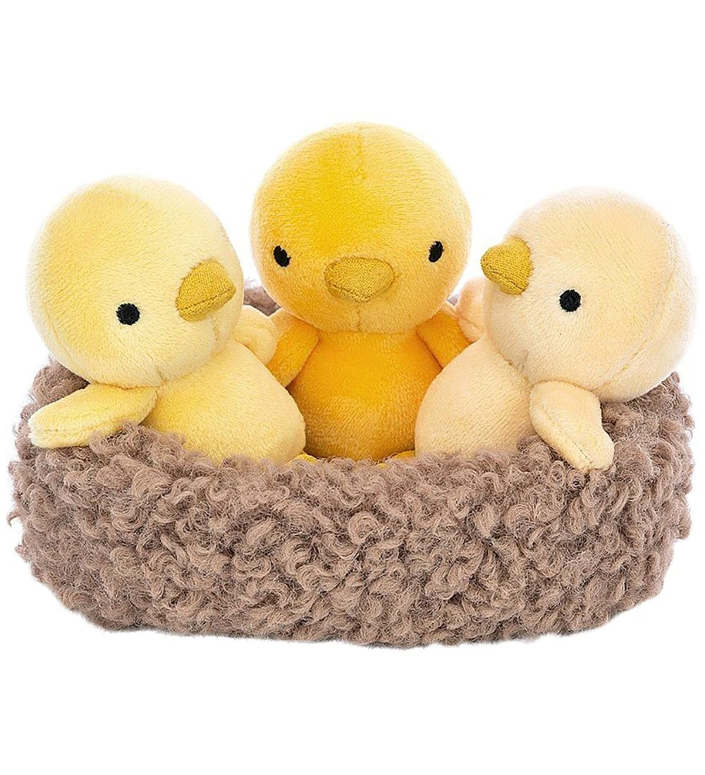 Søde Jellycat bamser formet som små, gule kyllinger, der sidder i en rede af lysebrunt, krøller plys.