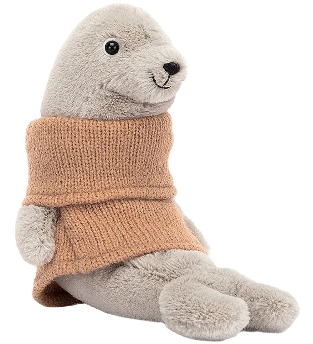 Skøn Jellycat bamse formet som en grå sæl med en brun bluse.