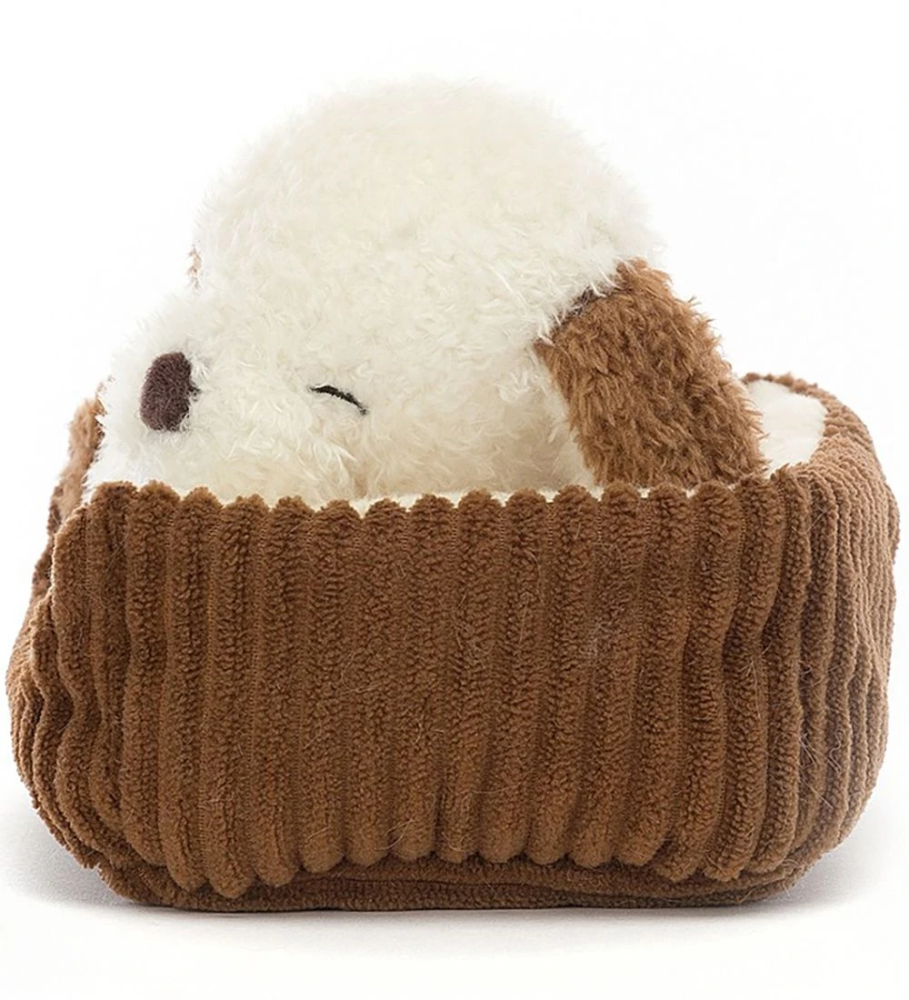 Skøn Jellycat bamse formet som en hundehvalp liggende i sin kurv.