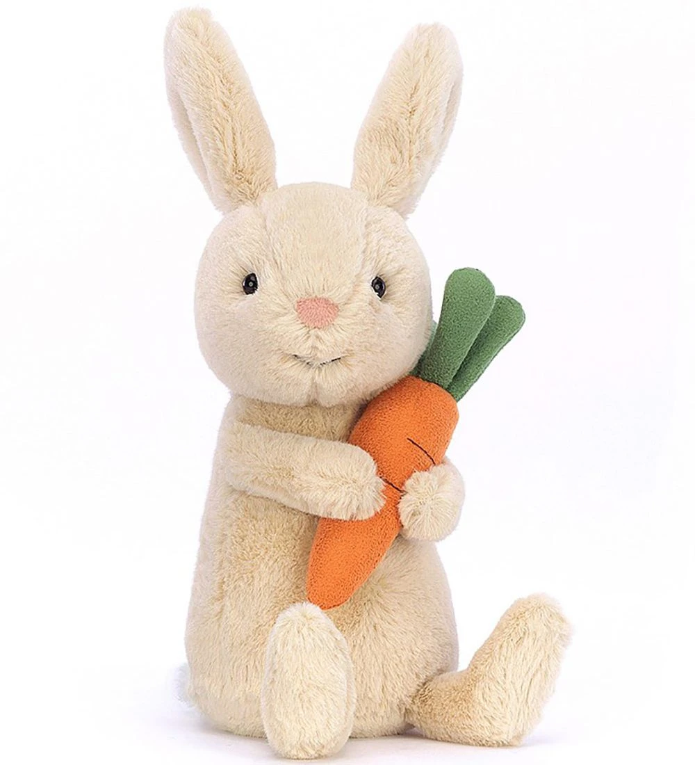 Sød Jellycat bamse formet som en beige kanin med en orange gulerod.