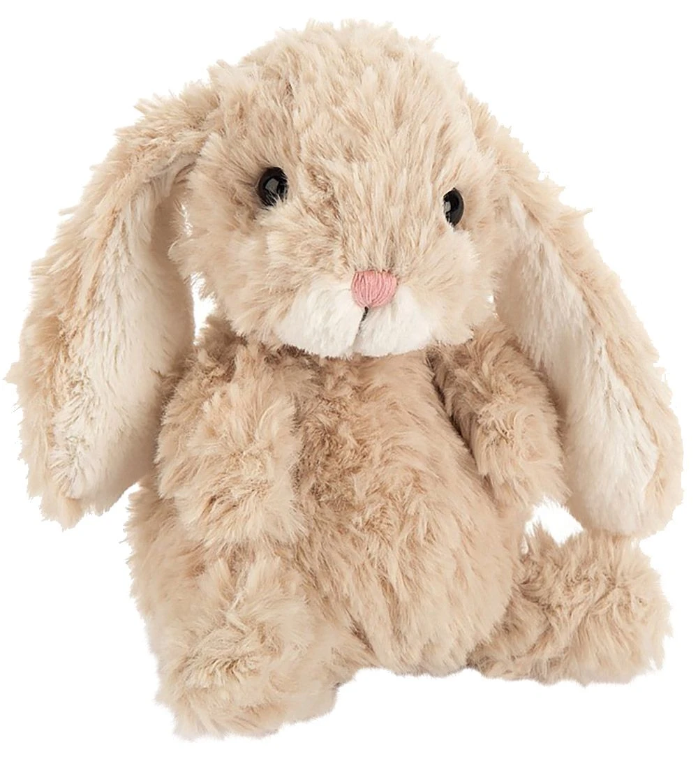 Sød Jellycat bamse formet som en lille kanin i beigefarvet, krøllet plys.