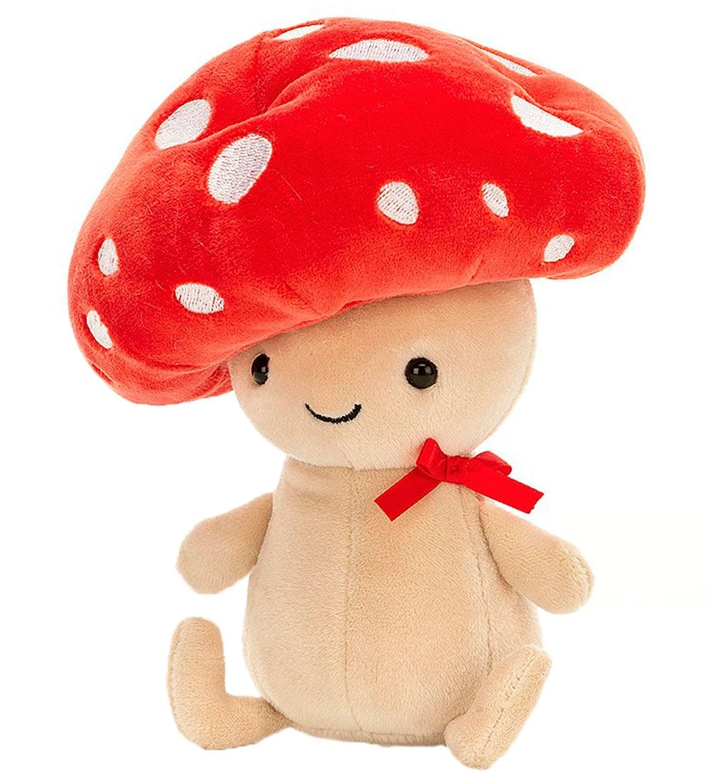 Sjov Jellycat bamse i beige med en stor rød hat med hvide prikker, så den ligner en fluesvamp.