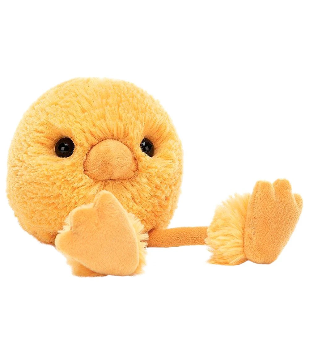 Skøn Jellycat bamse formet som en gul kugle af plys, der forestiller en kylling med lange ben og et lille næb.