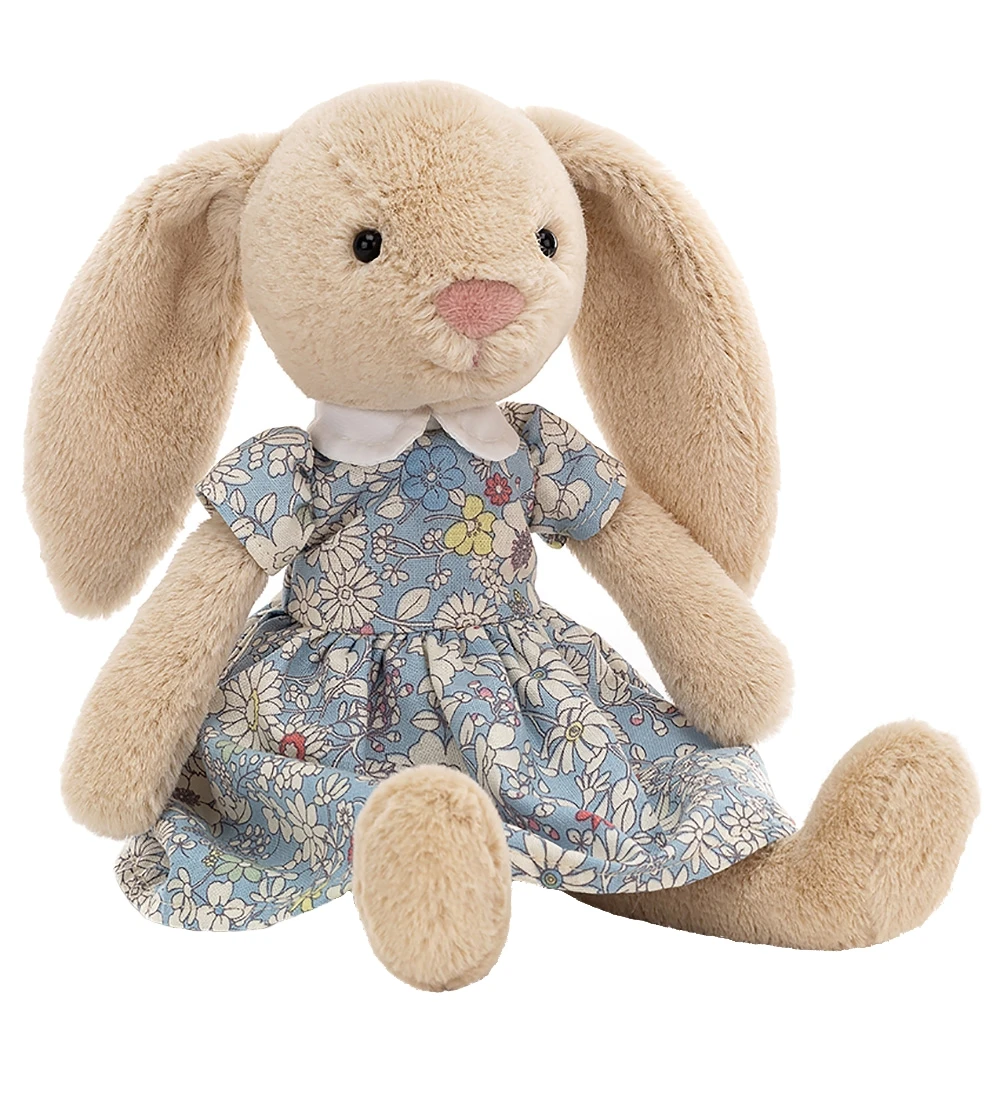 Sød Jellycat bamse i lysebrun plys og formet som en kanin med en fin kjole på i lyseblå med hvide blomster.