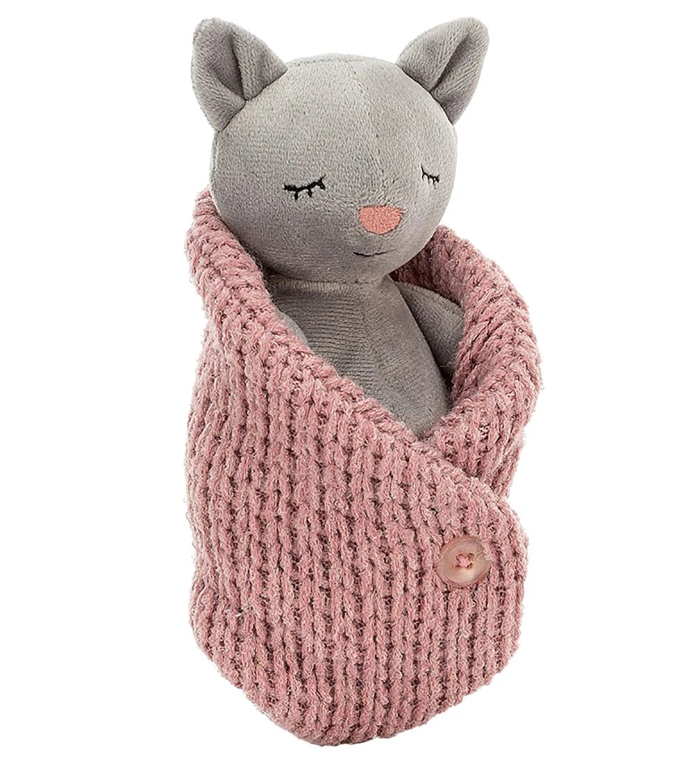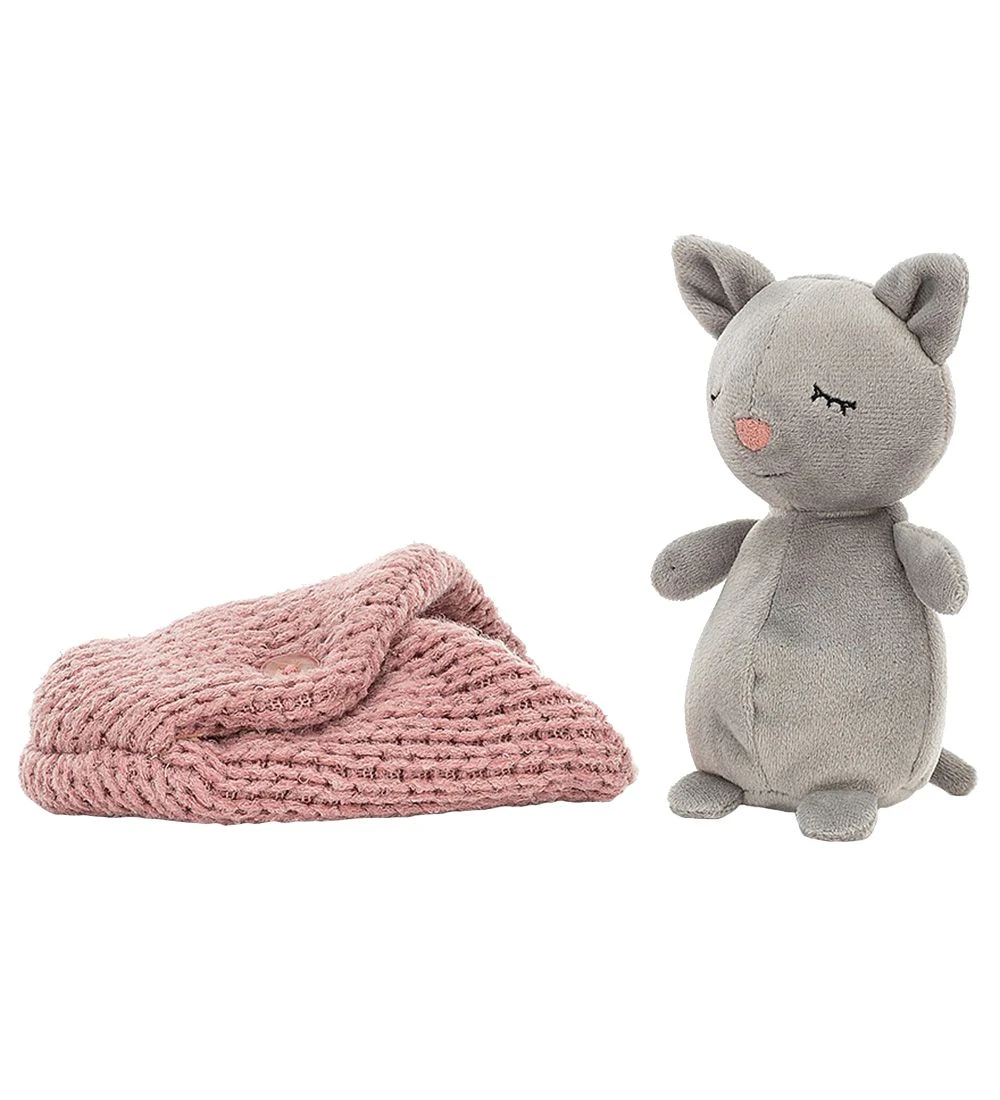 Sød Jellycat bamse formet som en grå kattekilling, der sover. Katten ligger i en rosa, strikket sovpose, som man kan putte den i.
