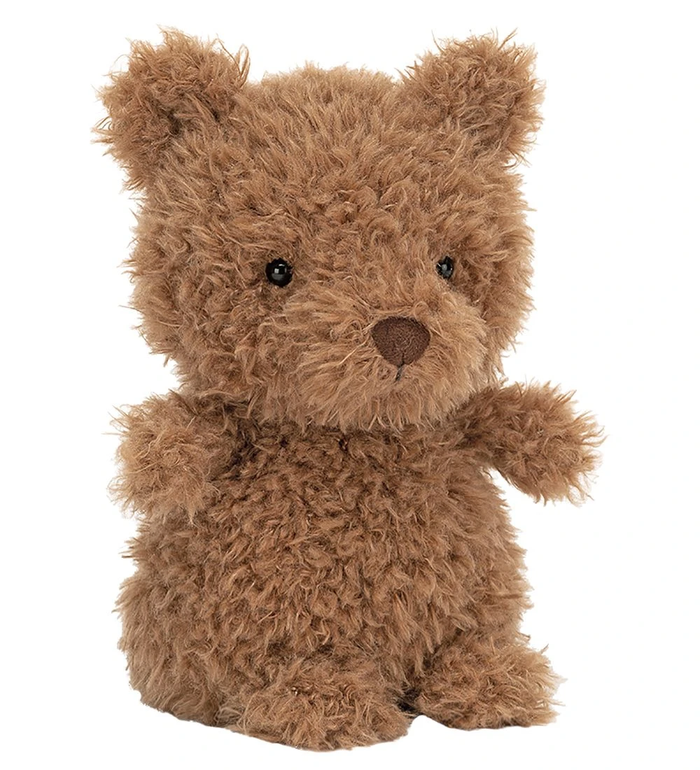 Sød Jellycat bamse formet som en bjørn i brun, krøllet plys.