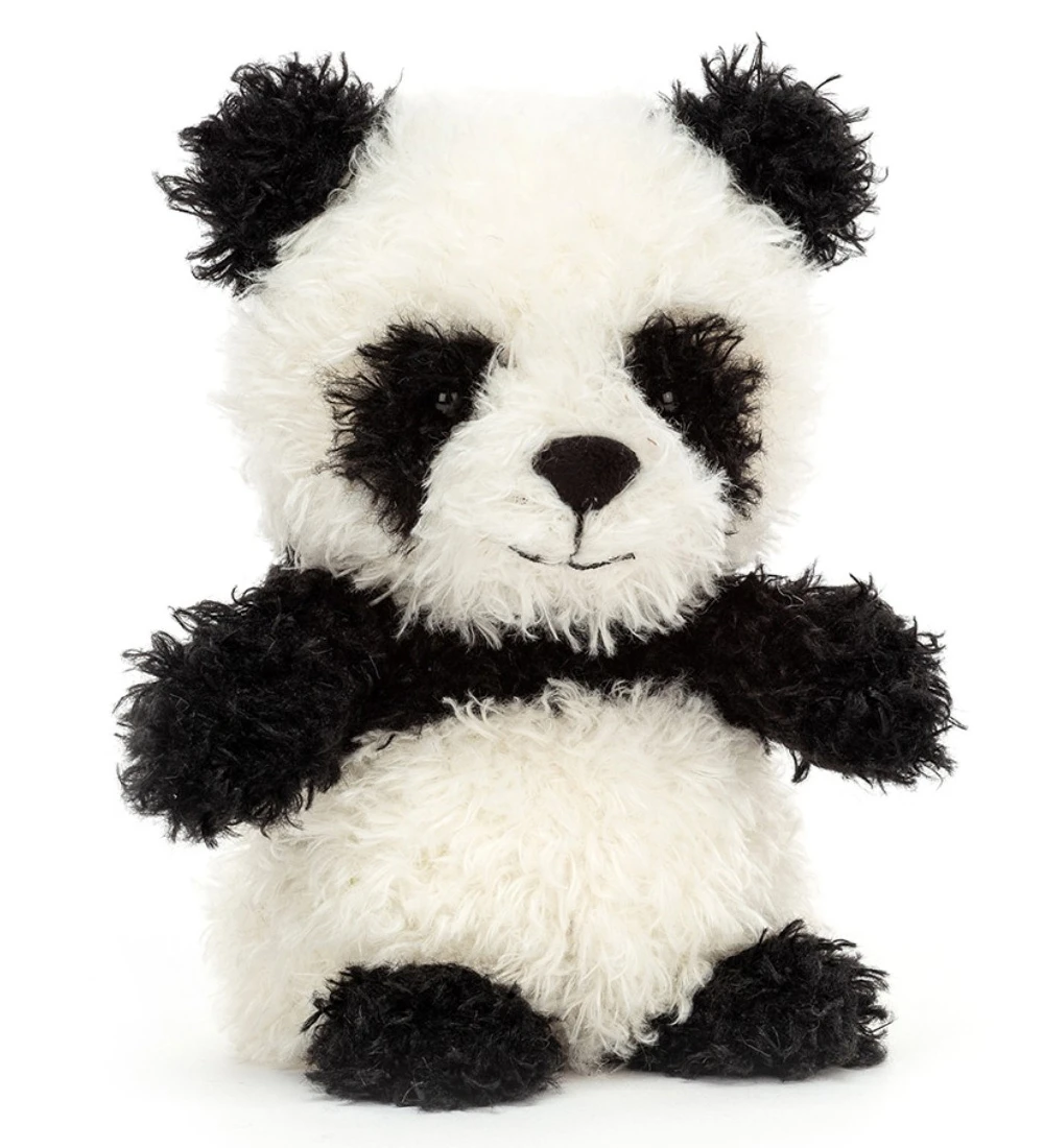 Sød Jellycat bamse formet som en panda i hvid og sort krøllet plys.