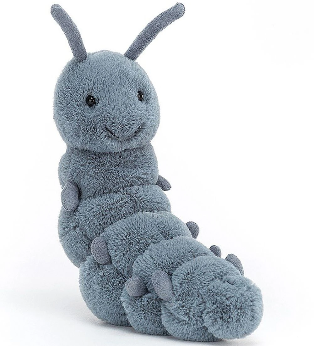 FIn Jellycat bamse formet som en larve i støvet blå.