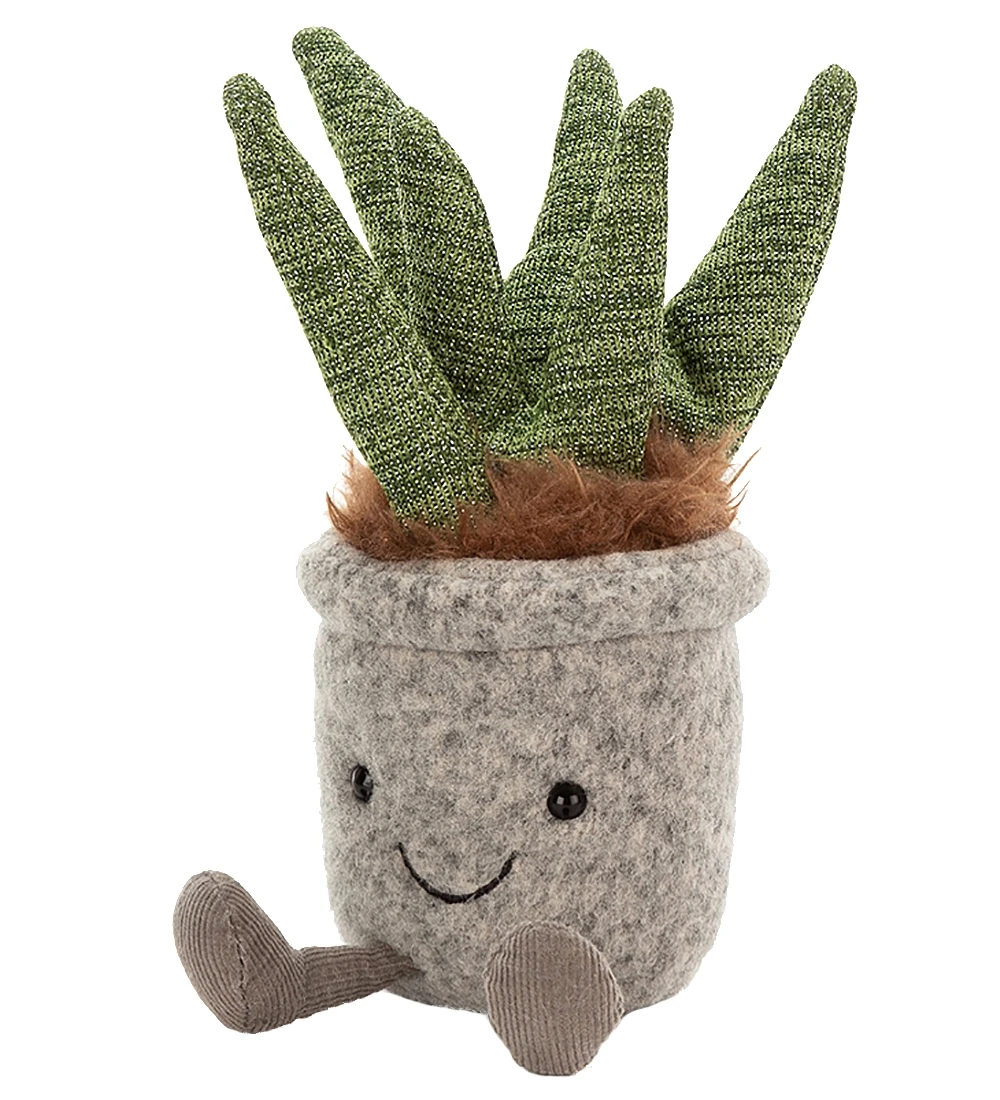 Sjov Jellycat bamse formet som en lille grøn sukkulent-aloe vera med guldglimmer i en grå potte. På siden af potten er der to sorte plastikøjne og en sort, broderet mund, og nedenunder sidder der to lange ben i gråt fløjl.