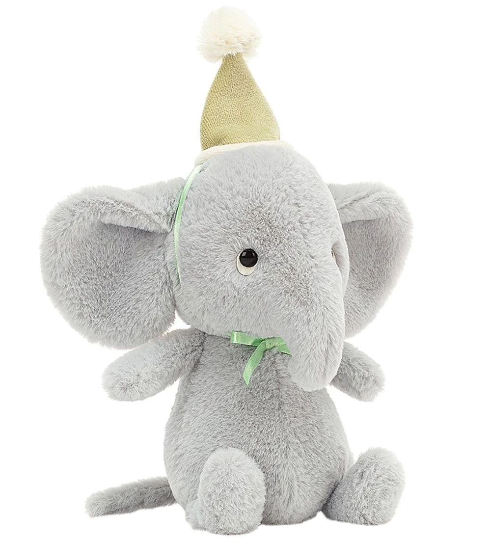 Sød Jellycat bamse formet som en elefant i lyseblå plys og med en lysegrøn hue med en hvid pompon, og den er bundet om hagen med et smalt, lysegrønt bånd.
