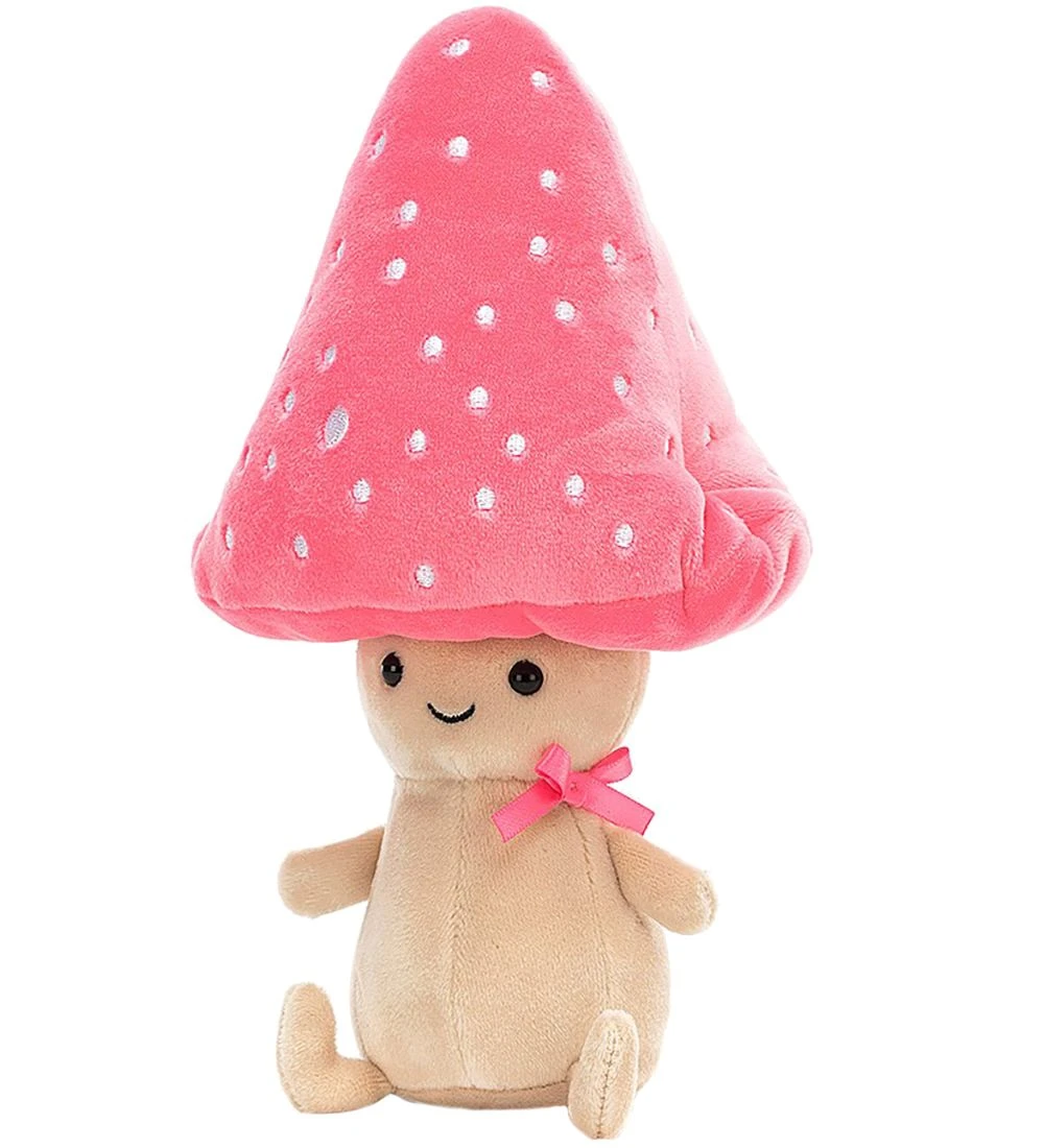 Skøn Jellycat bamse formet som en svamp med en rosa top med hvide prikker, og i bunden er den beige.