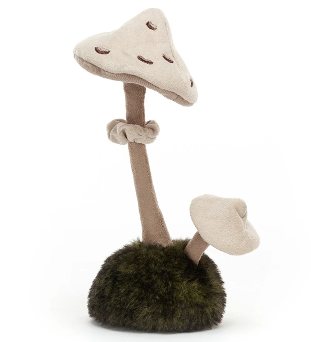 Sjov Jellycat bamse formet som to svampe, der vokser på en knold af mørkegrønt plys. Svampene er af arten kæmpeparasolhat.