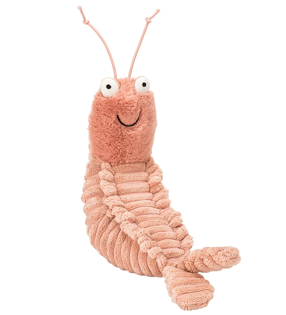 Sjov Jellycat bamse, som er formet som en reje i lyserød plys.