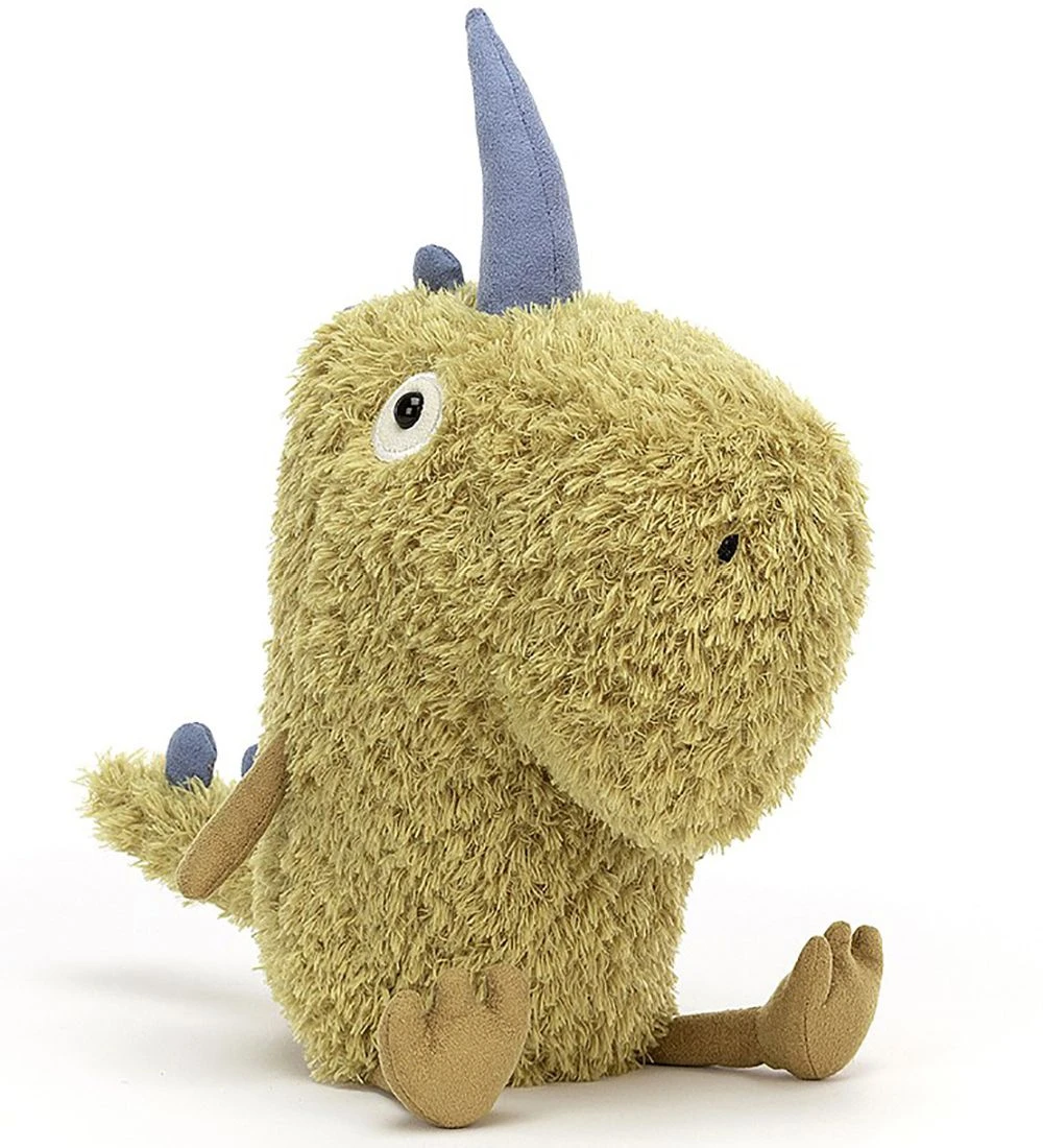 Sjov Jellycat bamse formet som et rumvæsen i grøn plys med lilla detaljer.