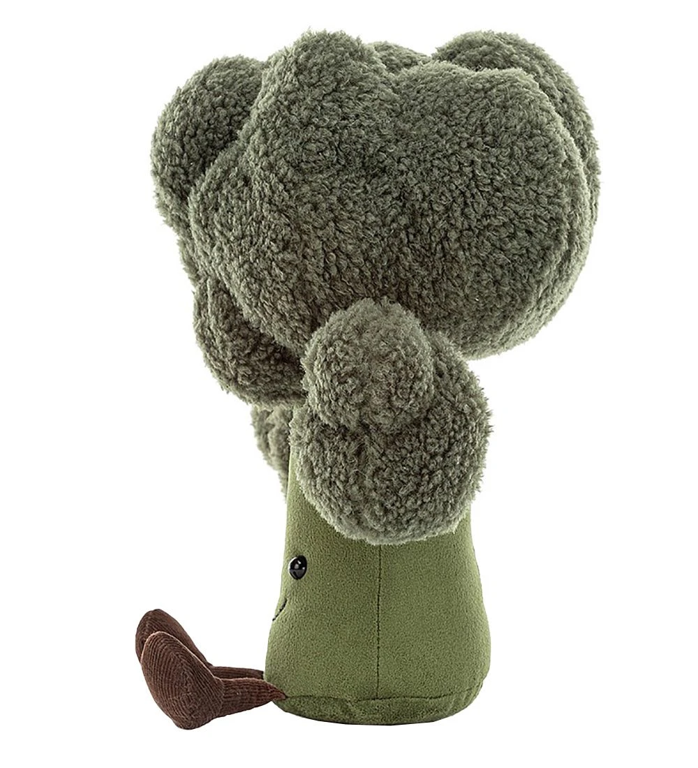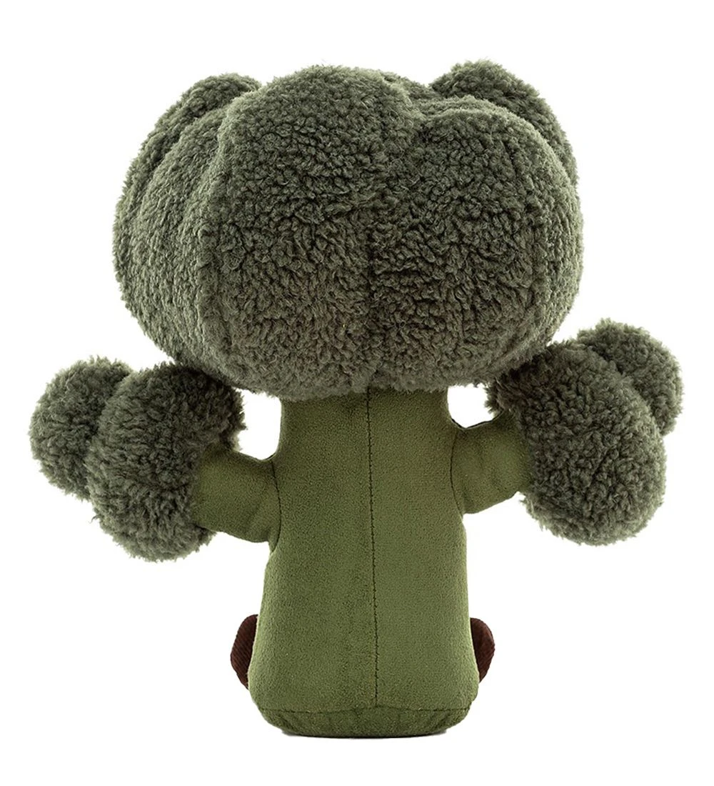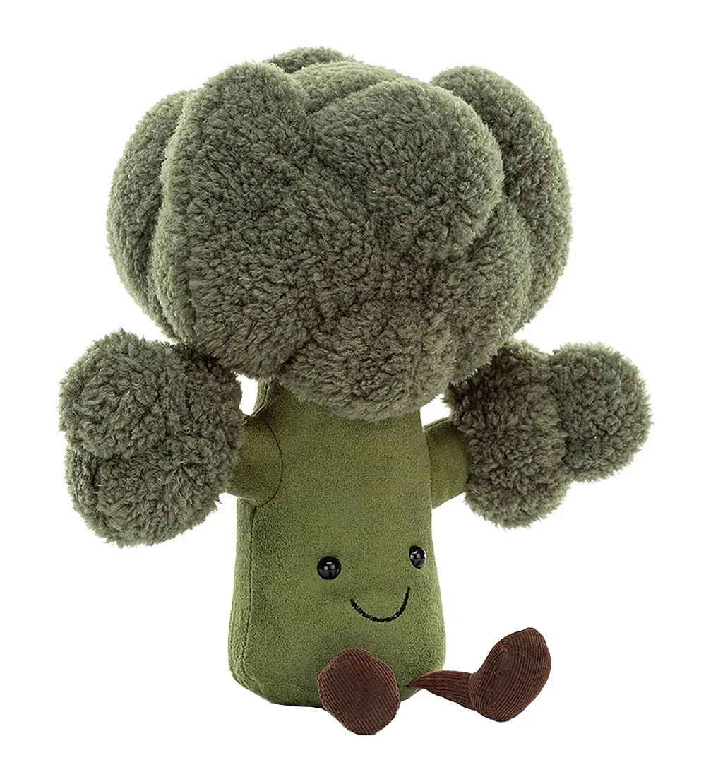 Sjov Jellycat bamse formet som en mørkegrøn broccoli pære med øjne og mund og lange brune ben i bunden.