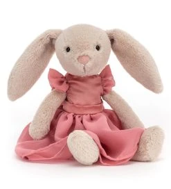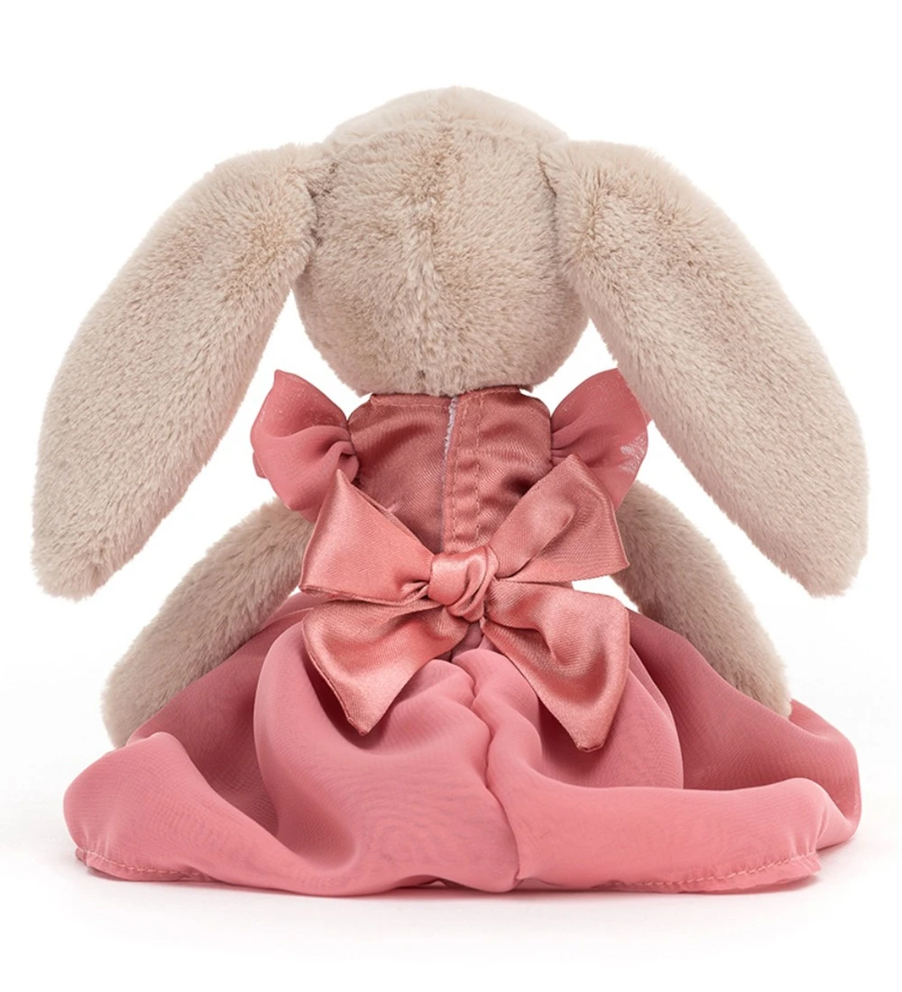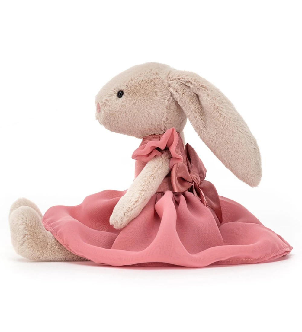 Fin Jellycat bamse i formet som en beige kanin med en flot, lyserød kjole på.