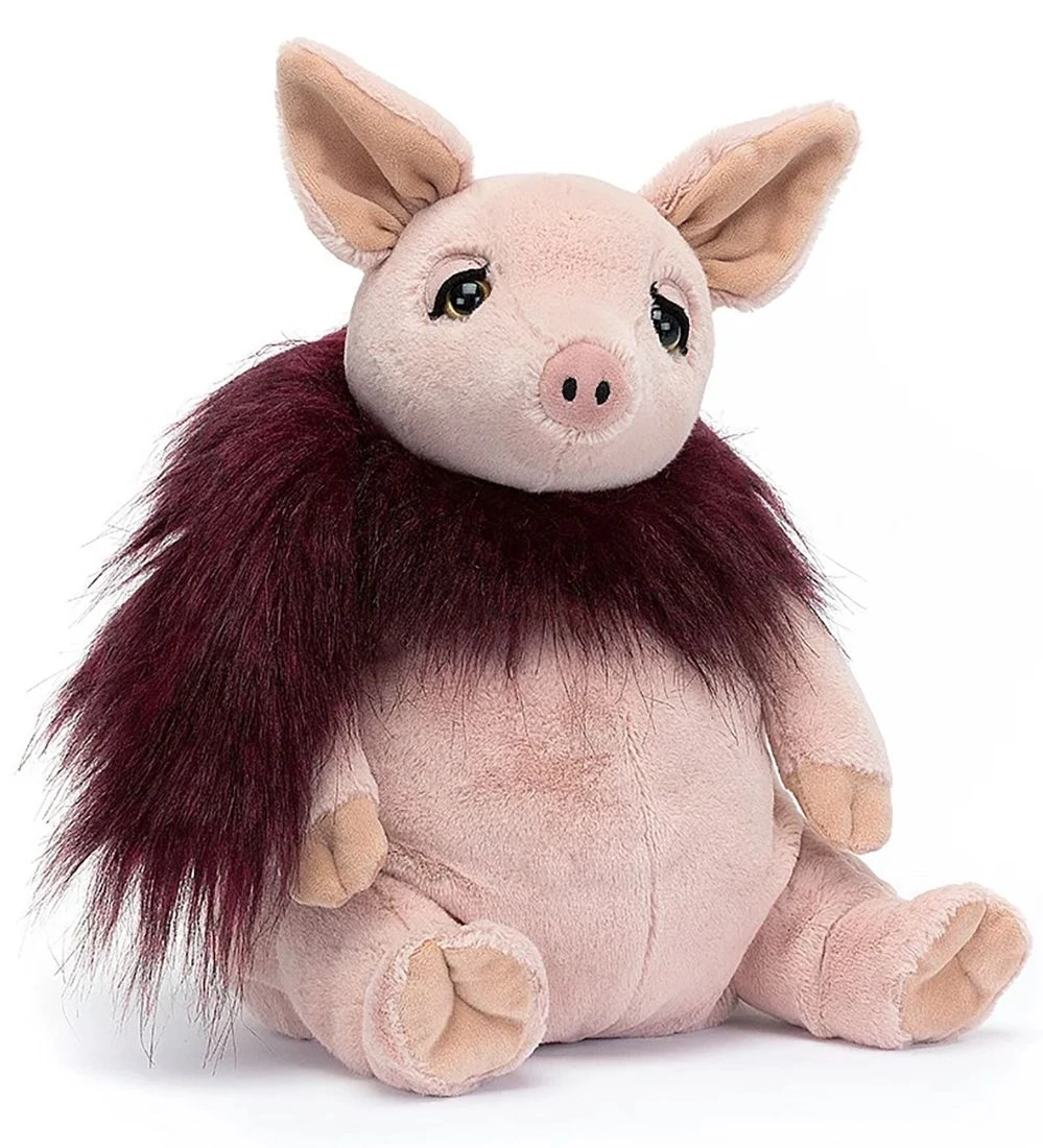 Skøn Jellycat bamse formet som en rosa gris med et tørklæde.