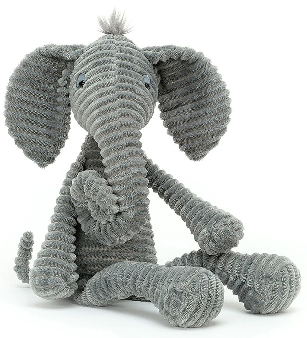 Skøn Jellycat bamse formet som en elefant i gråt jernbanefløjl.