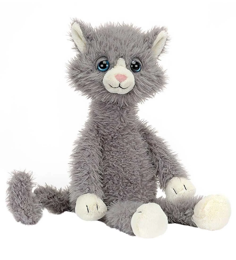 Fin Jellycat bamse med form som en pjusket kat i grå med store, trætte øjne.