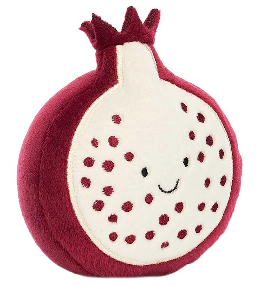 Flot Jellycat bamse som forestiller et halvt granatæble i mørkerød og hvid med et smilende ansigt.