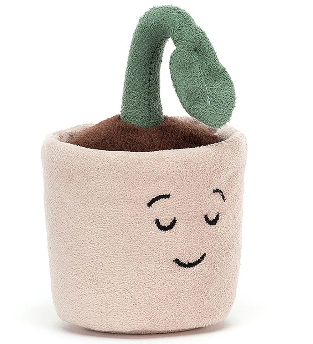 Fin Jellycat bamse formet som en lille spirende plante i grønt plys i en beigefarvet potte. På siden af potten er der broderet to lukkede øjne samt en mund.