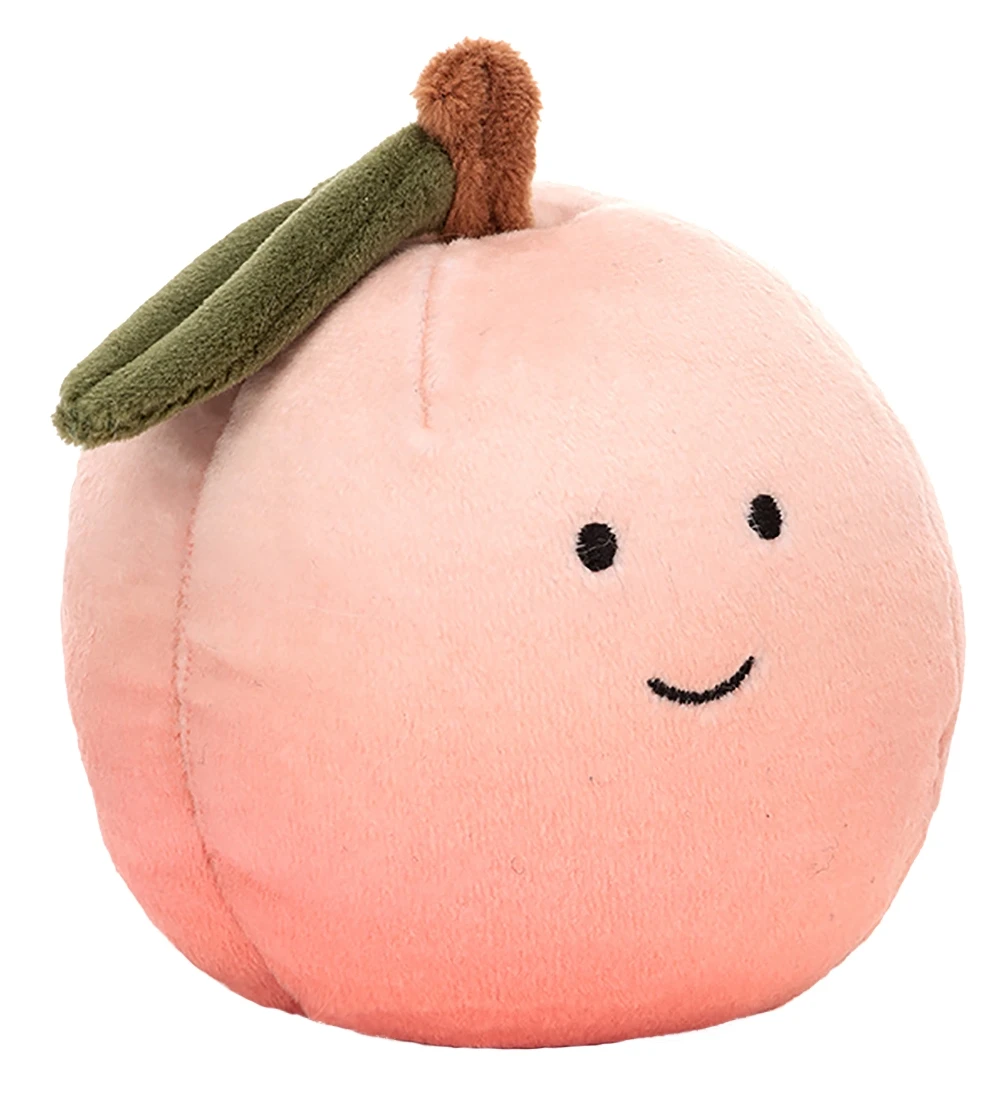 Sjov Jellycat bamse formet som en koralfarvet fersken med sorte, broderede øjne og mund. I toppen har den en brun stilk og et mørkegrønt blad.