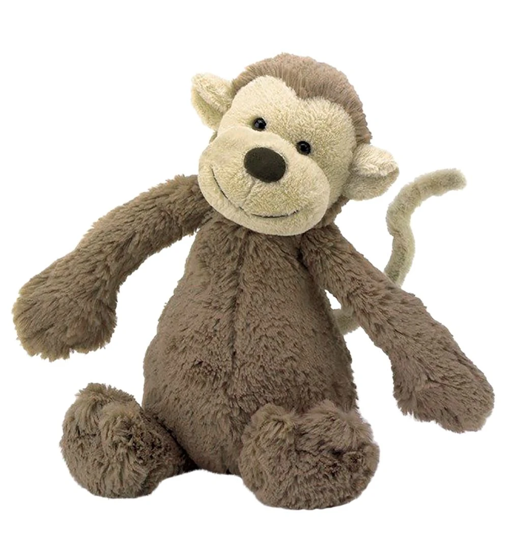 Skøn Jellycat bamse i formet som en brun abe med beigefarvede detaljer.