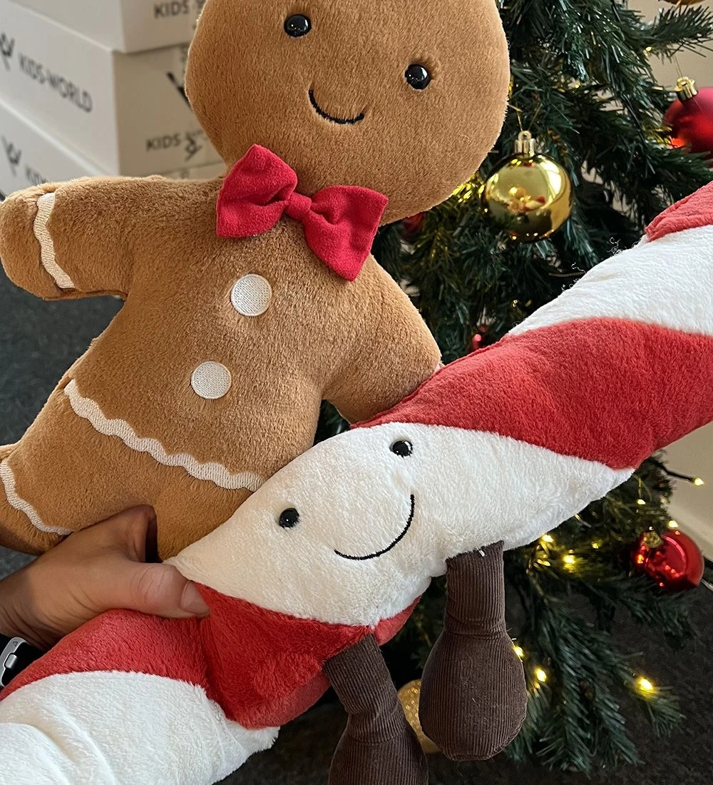 Skøn Jellycat bamse formet som slikstok med striber i rød og hvid plys. På siden er der to små, sore øjne og en smilende mund, og nedenunder sidder der to ben af brunt fløjl.