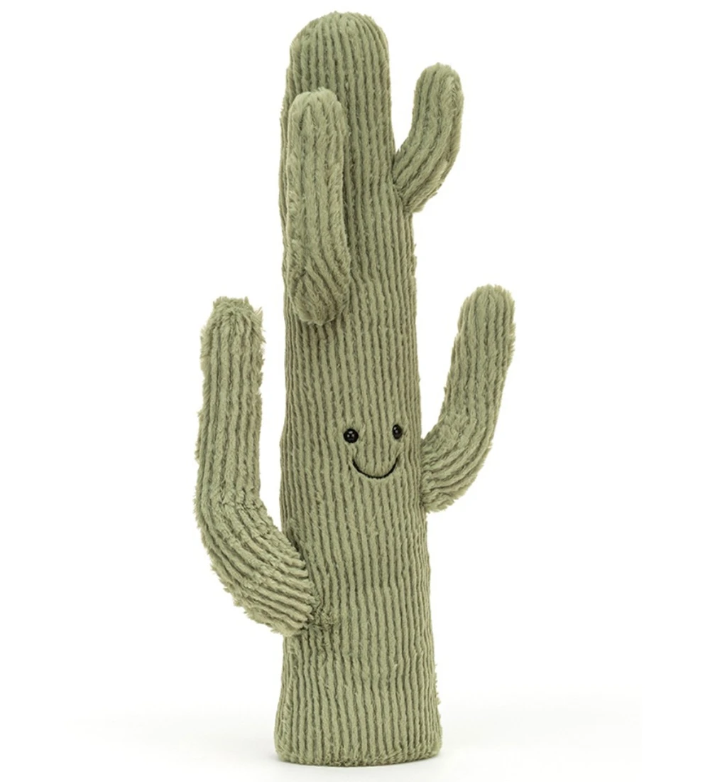 Sjov Jellycat bamse formet som en stor ørkenkaktus i grønt fløjl, og på siden sidder der to sorte plastikøjne og en sort, broderet mund.