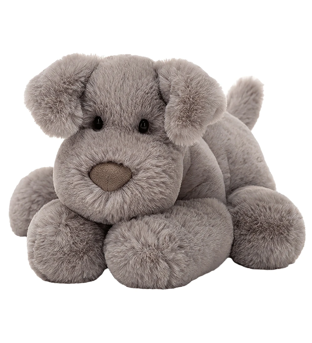 Sød Jellycat bamse i grå og formet som en liggende hund.