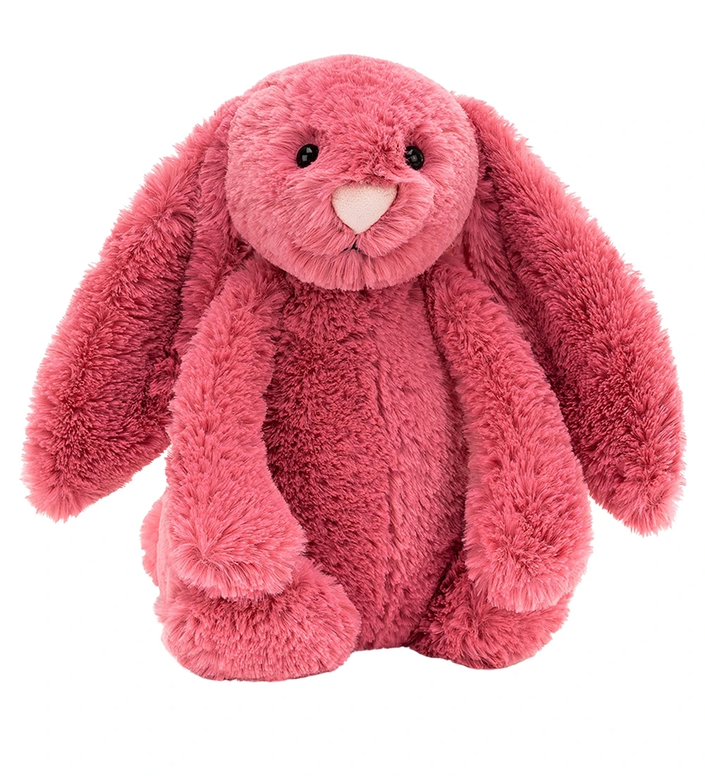 Fin Jellycat bamse formet som en kanin i mørk pink plys.