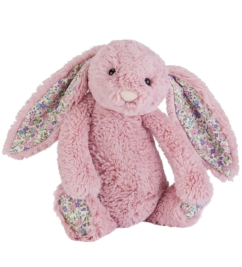 Sød Jellycat bamse formet som en kanin i rosa plys, og på indersiden af ørerne og under poterne er der et fint liberty-print med blomster i rosa, lilla og blå nuancer.
