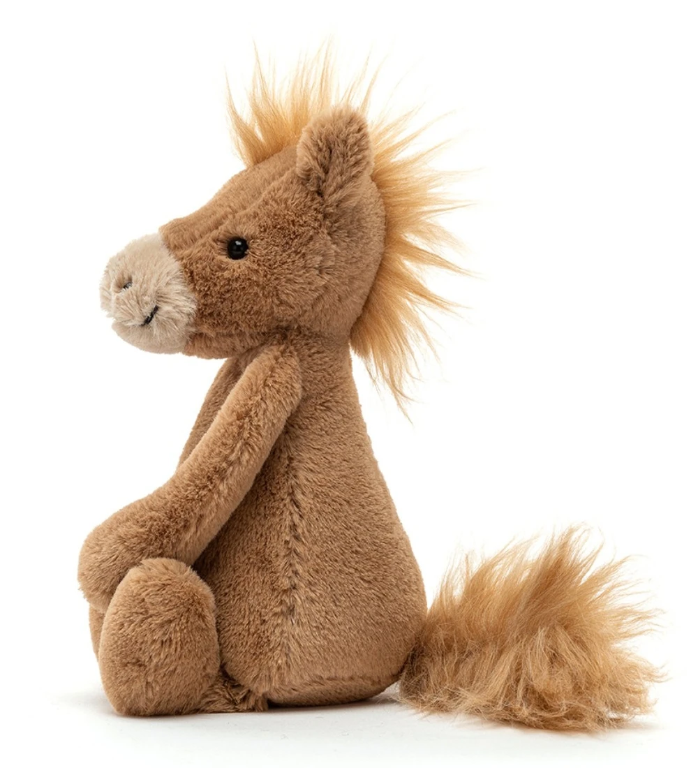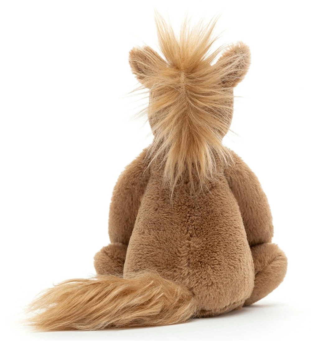 Skøn Jellycat bamse i formet som en brun pony, der sidder ned. Hesten har en langhåreyt manke og hale.