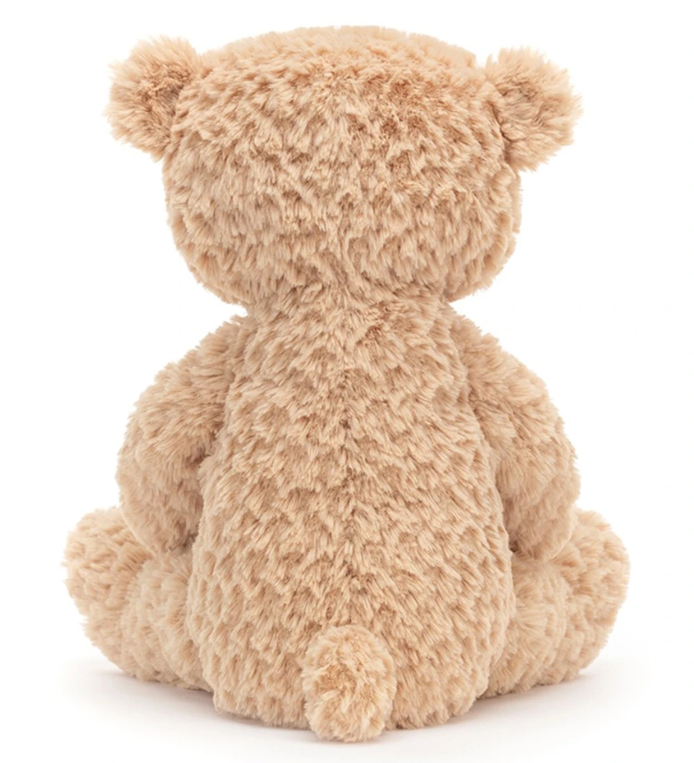 Fin Jellycat bamse formet som en bjørn i brun, krøllet plys.