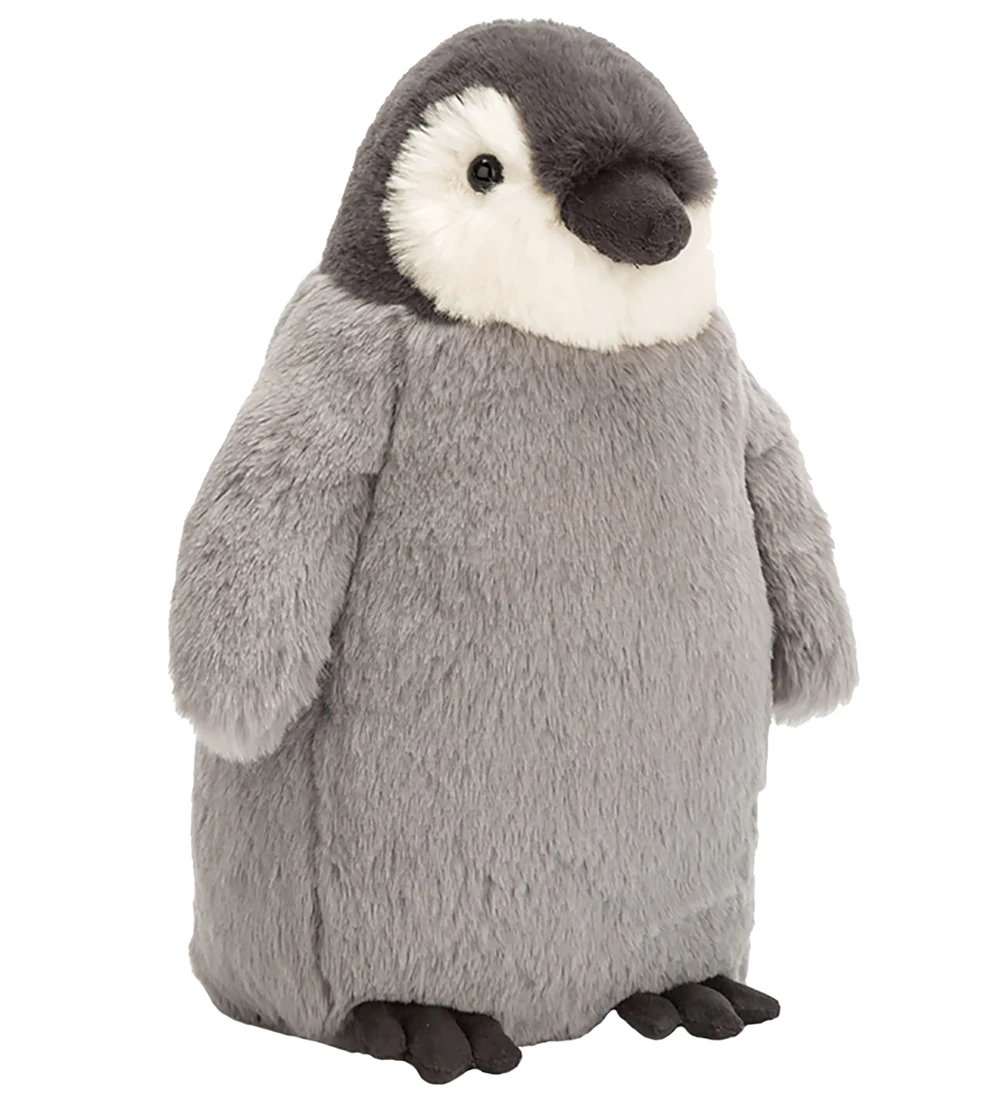 Sød Jellycat bamse i formet som en pingvin i grå nuancer og med hvide detaljer.
