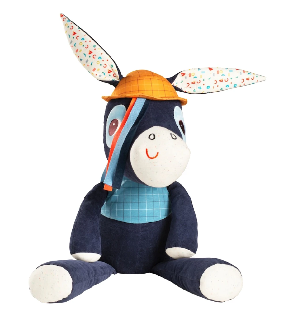 Fin Lilliputiens bamse som forestiller æslet Ignace, som er i navy fløjl med hvide felter som har prikker og former i forskellige farver. Han har også en karrygul hat og en lyseblå bluse med tern.