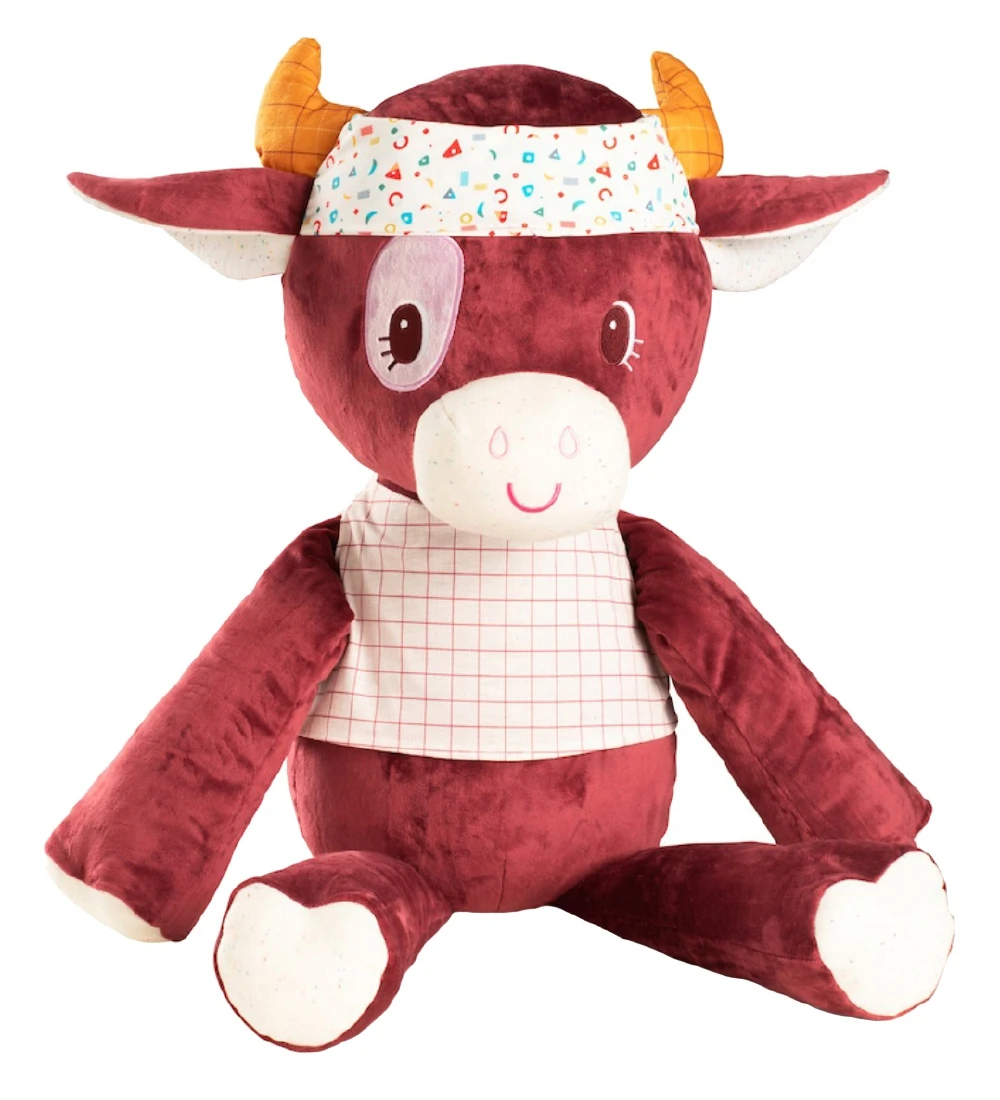 Sød Lilliputiens bamse som forestiller koen Rosalie, som er i lilla velour med hvide felter som har prikker i forskellige farver. Hun har også en hvid hat med forskellige former samt en hvid bluse med lilla tern.
