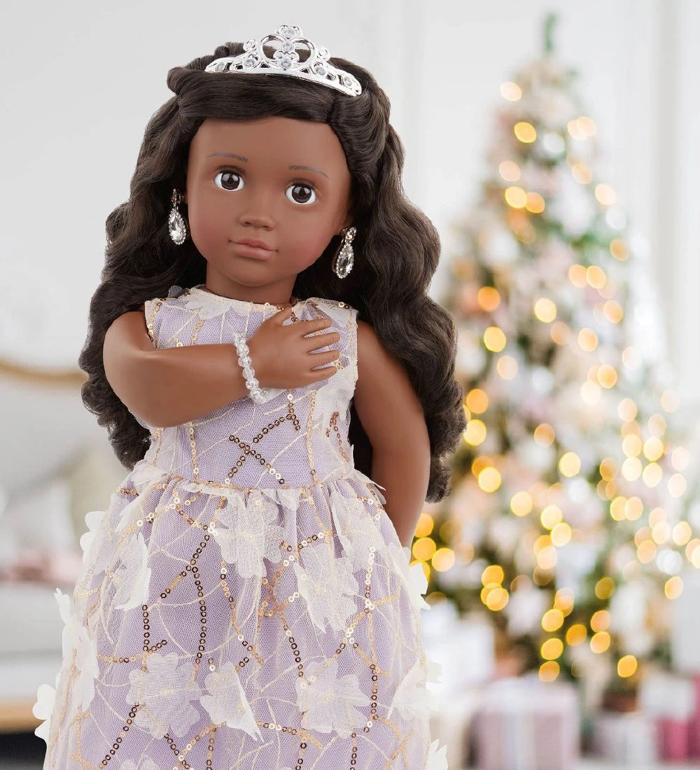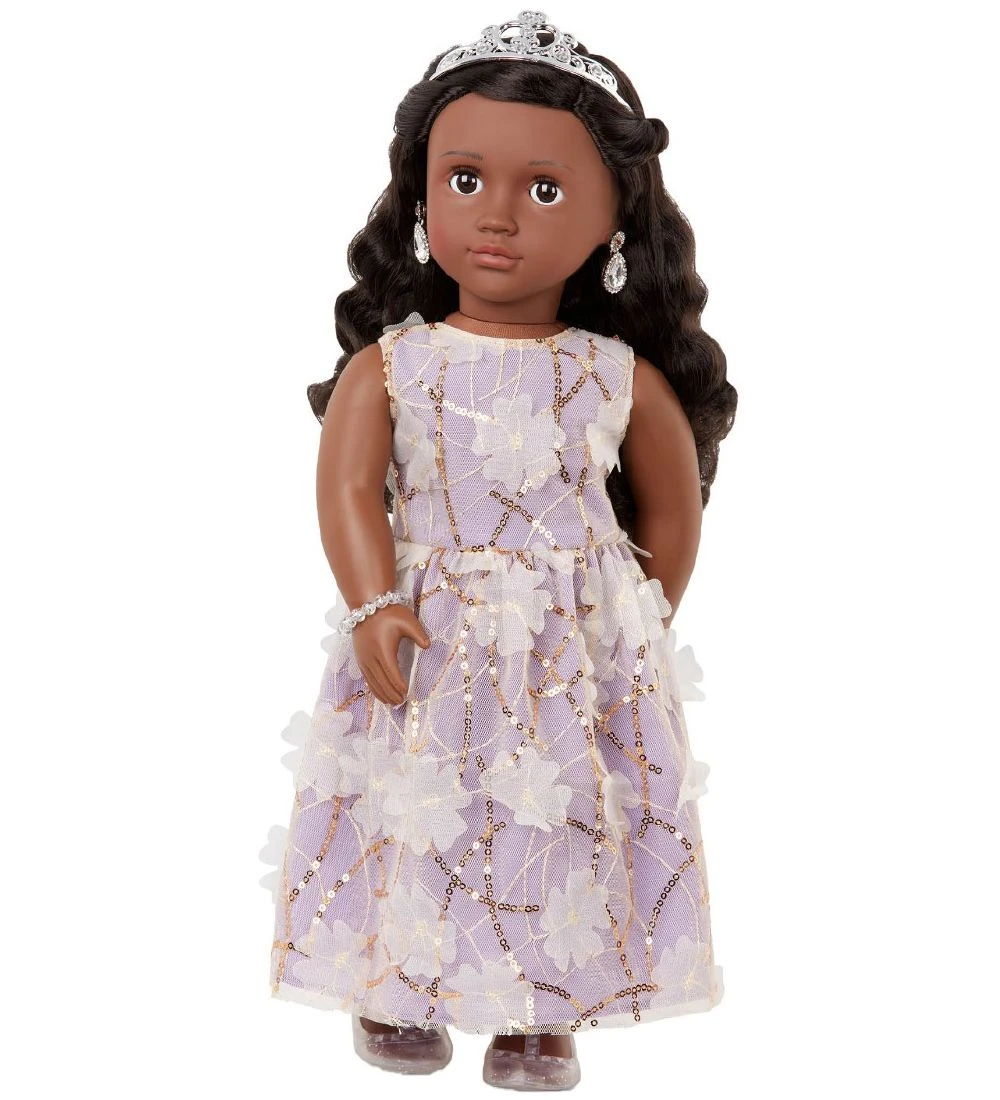 Fin Our Generation Ambreal dukke. Ambreal har brune øjne, der kan åbnes og lukkes, og langt, sort hår, som er opsæt i to rottehaler. Dukkens hoved, arme og ben er bevægelige, og hun er iført en lilla og hvid kjole med blomster. Hun har huller i ørene og fine øreringe.